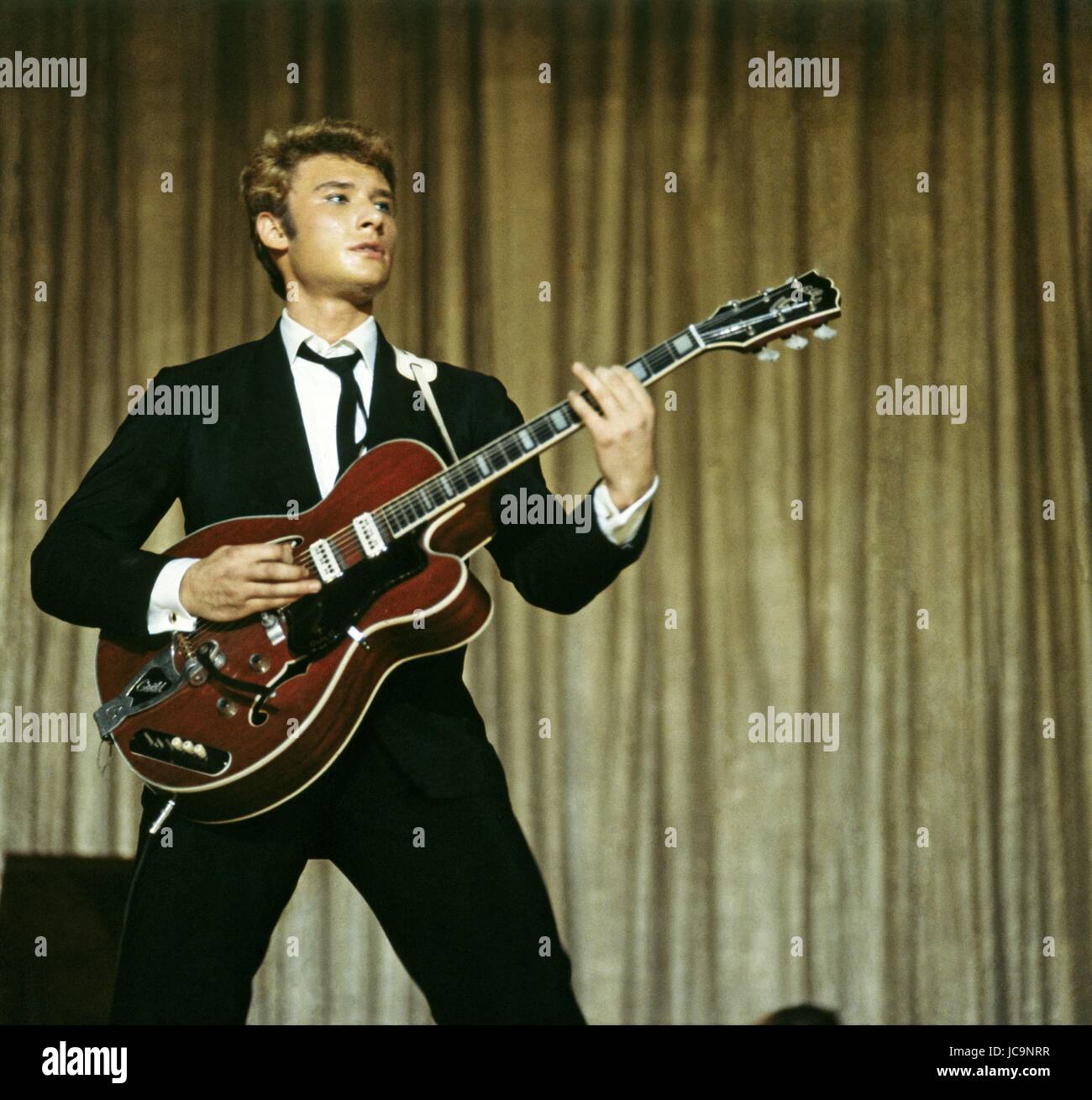 Franzosischer Sanger Johnny Hallyday Wahrend Eines Konzerts Auf Der Buhne Der Olympia Halle In Paris Im Februar 1964 Stockfotografie Alamy